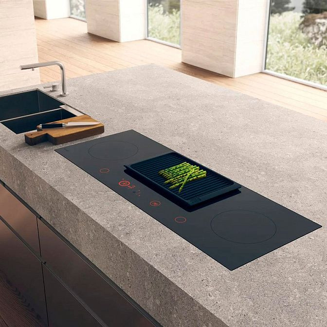 Эта модель сочетает в себе строгую эстетику и продуманный набор функций для современной кухни. Компактный Domino-дизайн в черном цвете и поверхность OptiGlass создают ровное, минималистичное поле без лишних элементов, где рамка из чёрной матовой стали подчеркивает островки готовки и одновременно сохраняет общую сдержанность. Низкий профиль и исполнение «вровень со столешницей» позволяют интегрировать прибор заподлицо, обеспечивая плавные переходы и аккуратный внешний вид; обработка края выполнена так, чтобы не нарушать общий стиль, а черная стеклокерамика легко сочетается с различными материалами столешниц.
