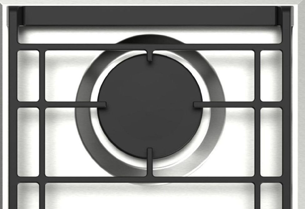 - Нержавеющая сталь, чугунные решетки и скошенные края обеспечивают стильный внешний вид и удобство чистки после готовки.