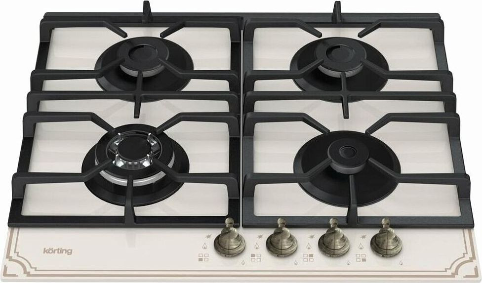 Рабочая зона представлена четырьмя конфорками разного диаметра и мощности: передняя левая 3,1 кВт (240x200 мм) для интенсивного нагрева, две боковые по 1,7 кВт и передняя правая 0,95 кВт (145x145 мм) для медленного томления и поддержания температуры. Особая многоконтурная конфорка типа «тройная корона» поддерживает равномерное распределение пламени и подходит для посуды различного диаметра, минимальный диаметр посуды — 12 см. Решетки из чугуна надежно фиксируют посуду, а наличие WOK-зоны и отдельной подставки увеличивает универсальность приготовления блюд восточной кухни.