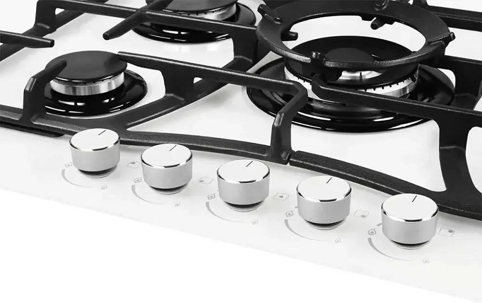 Элегантная варочная поверхность сочетает современный внешний вид и продуманную функциональность: закаленное стекло белого цвета задает стильный тон кухне, а скрытые интегрированные ручки сохраняют ровную линию и удобство в уходе. Чугунные решетки обеспечивают устойчивость посуды и равномерное распределение тепла, сохраняя эстетичный контраст с глянцевой поверхностью. Отсутствие рамки и установка вровень со столешницей создают эффект бесшовного перехода, удобного для плит с толщиной столешницы от 50 мм и для решений в стиле Hi-Tech.