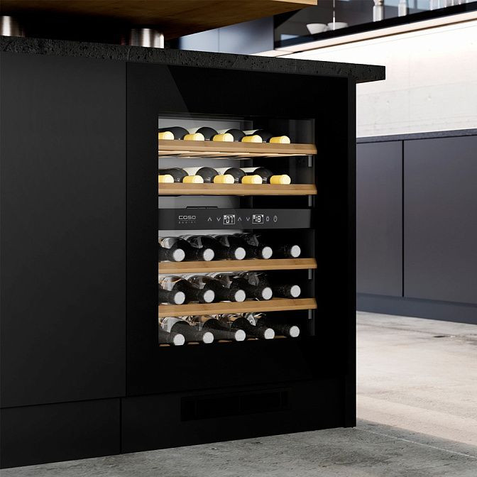 Управление сенсорное, панель расположена на корпусе, дополнена индикацией текущей температуры и ярким дисплеем для удобства контроля. Для удалённого мониторинга и настройки предусмотрено управление по Wi_Fi через приложение CASO, а съёмный цоколь облегчает монтаж и сервис. Встроенный вентилятор обеспечивает равномерное распределение холода по камере, поддерживая стабильность микроклимата, а система контроля влажности защищает пробки и структуру напитков.