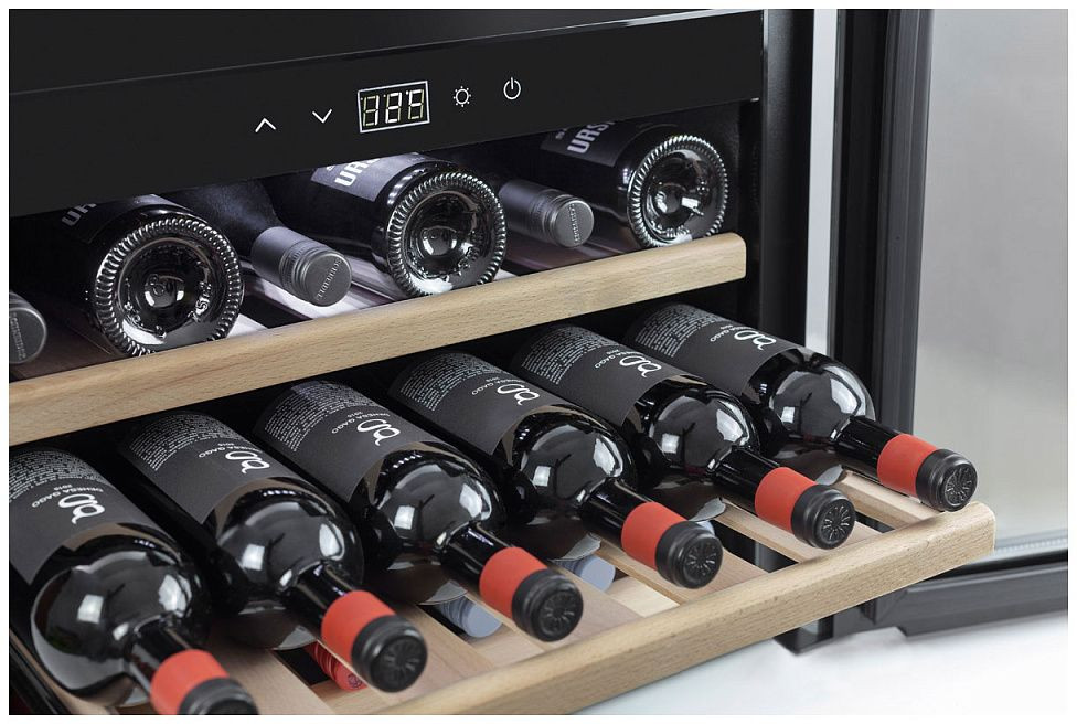 Эта модель представляет собой элегантный монотемпературный аппарат, выполненный в сдержанном черном оформлении и рассчитанный на размещение под столешницей или в нише с размерами 560—570x450x550 мм; при этом конструкция не предназначена для полного заподлицо встраивания, что сохраняет удобство доступа и упрощает установку. Узкий корпус (106,5x40x60 см) занимает минимум места, при этом обеспечивает внутренний объём 127 л и вмещает до 18 стандартных бутылок, аккуратно расставленных на трех выдвижных деревянных полках с черной отделкой. Полки выполнены так, чтобы бутылки легко извлекались и возвращались, при этом отсутствие регулировки высоты упрощает планирование постоянного хранения коллекции одного формата.