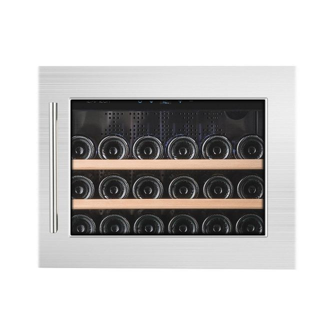 Элегантный вставной аппарат выполнен в стальном оттенке с стеклянной дверцей, защищенной от ультрафиолетового излучения, что сохраняет визуальную привлекательность бутылок и защищает напитки от фотоокисления. Компактный прямоугольный корпус гармонирует с современными кухонными и барными гарнитурами: стальные боковые стенки и черные деревянные полки создают контрастную, но сдержанную композицию. Ручки из стали черного цвета органично дополняют лицевую панель, а прозрачная поверхность дверцы обеспечивает легкий визуальный доступ к содержимому без необходимости открывать камеру.