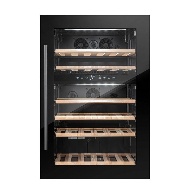 Внутреннее пространство рационально организовано: одна камера с двумя температурными зонами позволяет одновременно поддерживать оптимальные условия для столовых и игристых вин — верхняя и нижняя области управляются независимо, диапазон установки в каждой зоне варьируется от +5 до +20 °C, а цифровой дисплей и сенсорные кнопки, расположенные внутри, дают точный контроль и информируют о текущих параметрах. Для быстрой стабилизации температур предусмотрены функции суперохлаждения и суперзамораживания, а циркуляционная система и классический компрессор на хладагенте R600A обеспечивают равномерное распределение холода при стабильной работе и низком уровне шума до 41 дБ.