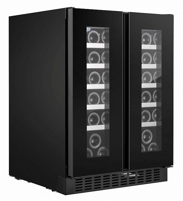 Сдержанный черный корпус из металла и прозрачная стеклянная дверца с защитой от УФ-лучей создают строгий, современный образ, идеально вписывающийся в интерьер кухни или встраиваемой зоны под столешницу. Внешняя отделка дополнена ручками из нержавеющей стали, удобными в использовании и выдержанными по стилю, а внутренняя светодиодная подсветка плавно подчеркивает бежевые деревянные полки, аккуратно расположенные на выдвижных направляющих с доводчиками. Стекло двери обеспечивает демонстрацию содержимого при сохранении стабильного микроклимата, а угольный фильтр и встроенный вентилятор равномерно распределяют свежесть по каждой из двух камер. Панель управления с сенсорными элементами и ярким дисплеем размещена внутри, что сохраняет лаконичность фасада и обеспечивает индикацию температуры без лишних деталей.