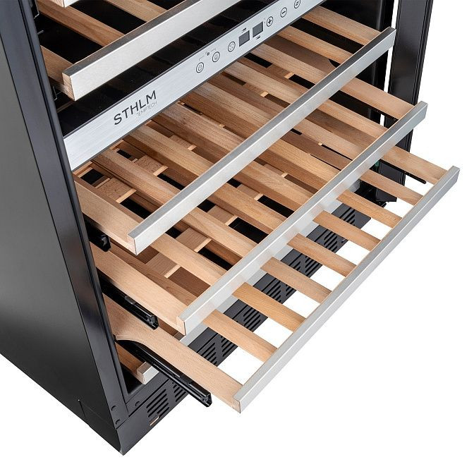 Конструкция предусматривает возможность встраивания и сенсорное открывание дверцы с направлением вправо, что упрощает доступ при размещении в мебельной нише. Для равномерного распределения холода внутри установлен встроенный вентилятор, который способствует поддержанию стабильных параметров в обеих зонах и минимизирует температурные колебания между полками. Внутреннее деление включает несколько отделений, выполненных в виде съемных деревянных полок черного цвета, которые сохраняют эстетичность и позволяют аккуратно размещать до 46 бутылок общего объема до 33 литров.