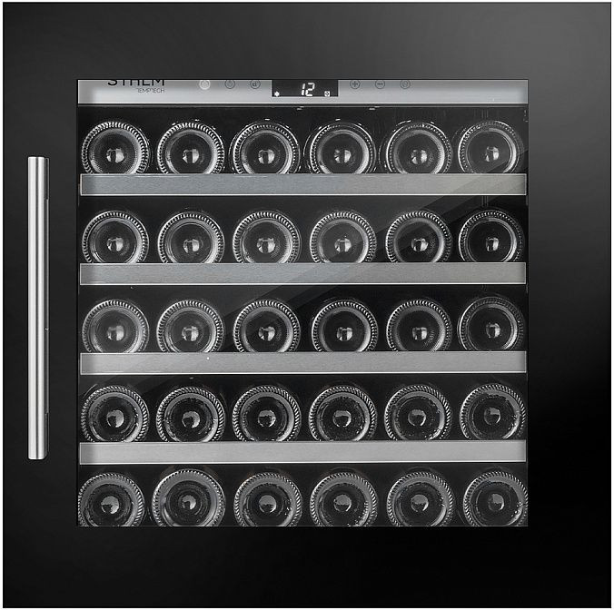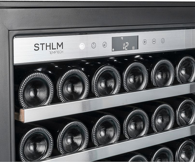 Корпус из металла и аккуратные ручки из нержавеющей стали подчеркивают современный образ, а внутренняя отделка полок выполнена из бежевого дерева — выдвижные платформы упрощают доступ к бутылкам и позволяют поддерживать порядок. Вместительность в 90 литров рассчитана на хранение до 30 стандартных емкостей, при этом пространство организовано одной температурной зоной с единственным режимом, управляемым сенсорной панелью, размещенной внутри камеры. Информативный дисплей и светодиодная подсветка создают комфорт при выборе нужной позиции и обеспечивают точное отслеживание текущей температуры.