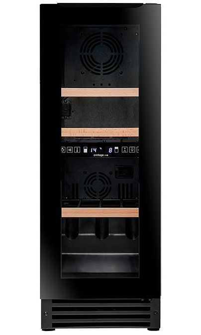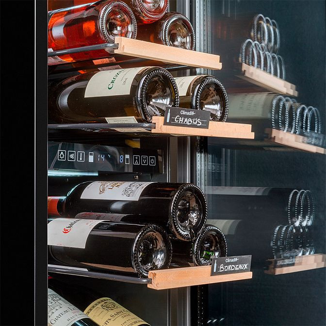 Внутри холодильника три полки, выполненные из металла и дерева. Они выдвигаются, что облегчает доступ к бутылкам. Одна из полок наклонная, что позволяет удобно разместить бутылки разных размеров. В комплекте также есть контейнер для воды и встроенный вентилятор для распределения температуры.