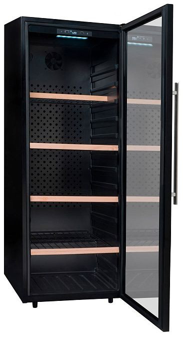 Дизайн холодильника также впечатляет. Черный цвет корпуса, выполненного из металла, придает ему элегантный и современный вид. Прозрачная дверь из стекла и стали позволяет легко просматривать содержимое, при этом защищая вино от УФ-лучей. Коричневые полки из дерева добавляют природный и теплый акцент в общий дизайн.