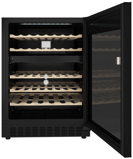 Встроенная конструкция рассчитана на нишу 825x600x575 мм, габариты самого прибора компактны: высота 82 см, ширина 59,5 см, глубина 57 см; длина сетевого кабеля 1,5 м и мощность подключения 18 Вт. Металлические боковые стенки и надежная сборка делают прибор долговечным, а регулировка ножек упрощает монтаж в рабочую поверхность. Светодиодная подсветка внутри создает мягкую экспозицию бутылок, а прозрачная дверь с УФ-защитой предотвращает деградацию напитков под воздействием света.