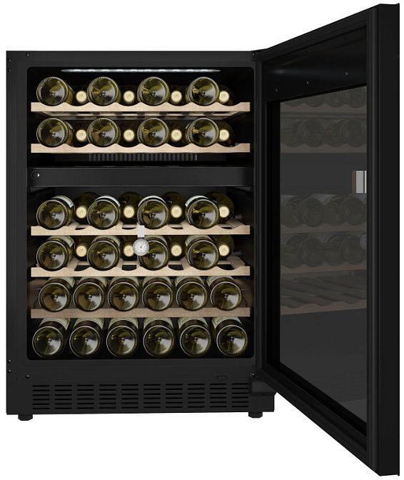 Элегантный встроенный винный шкаф в черном металлическом корпусе сочетает сдержанную эстетику и продуманную функциональность: прозрачная стеклянная дверца с защитой от УФ-лучей демонстрирует коллекцию, а скрытые ручки и серебристые металлические элементы подчеркивают стиль. Бежевая деревянная полочная система с выдвижными разделителями рассчитана на 46 бутылок и обеспечивает аккуратное хранение, при этом конструкция полок облегчает извлечение емкостей. Панель управления с дисплеем расположена на дверце для удобного контроля и настройки параметров, при этом интерфейс электронного управления интуитивно понятен и не нарушает визуальную гармонию фасада.