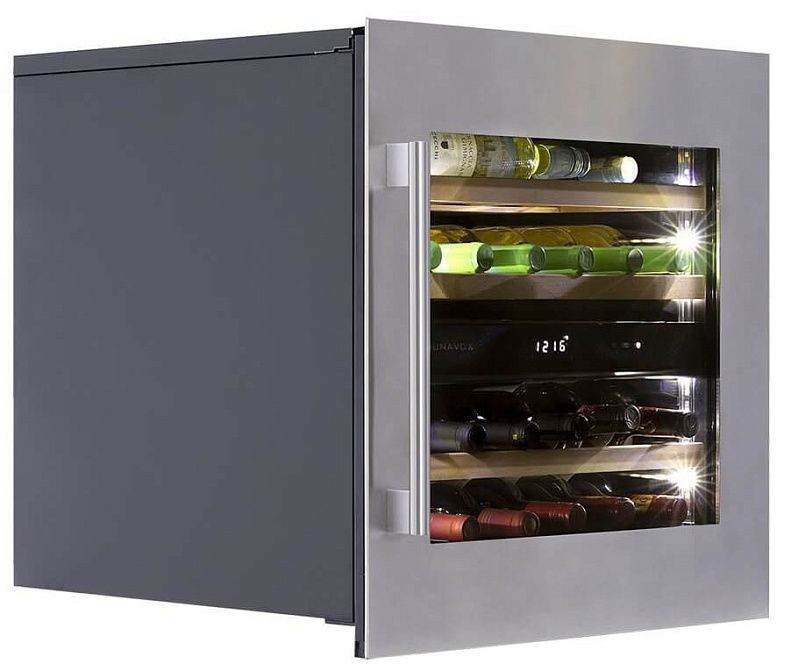 Холодильник оборудован одной дверью и одной камерой объемом 63 литра, которая вмещает до 25 бутылок вина. Внутреннее пространство оборудовано четырьмя полками из дерева, что обеспечивает удобное размещение бутылок и подчеркивает эстетическую привлекательность устройства. Встроенный вентилятор обеспечивает равномерное распределение температуры по всей камере, а система автоматического размораживания облегчает уход за устройством.