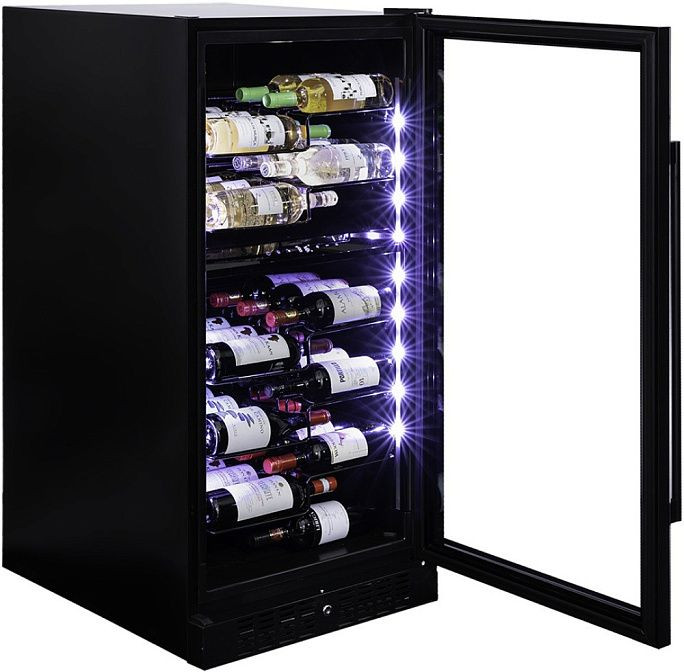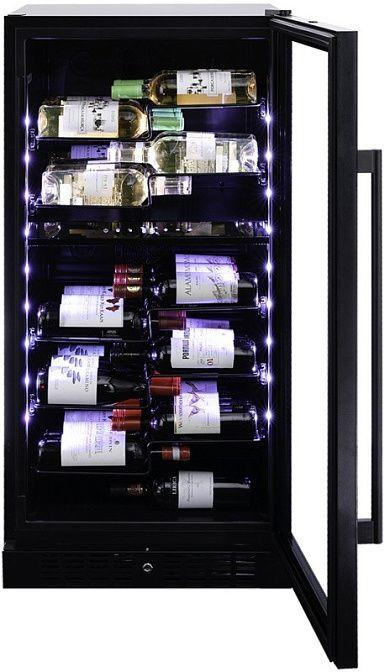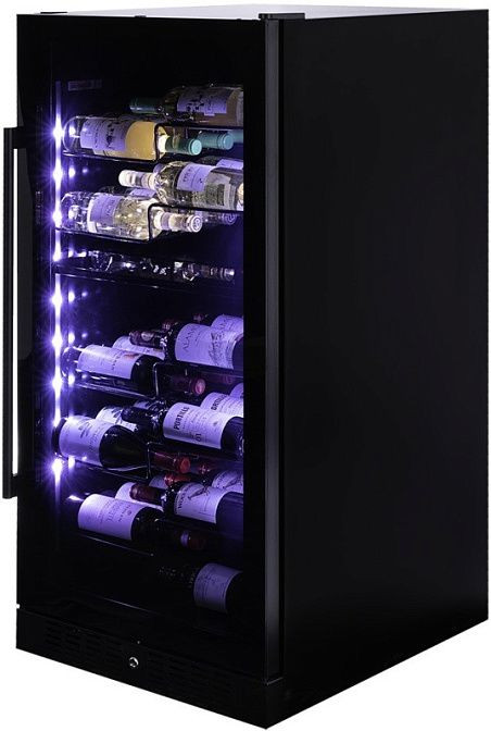 Винный холодильник удобен в использовании благодаря выдвижным полкам из металла. Они обеспечивают легкий доступ к бутылкам и упрощают хранение. Стекло дверцы с защитой от УФ-лучей защищает вино от нежелательного воздействия света.