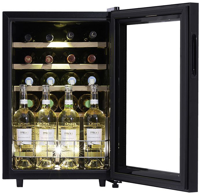 Дверь холодильника изготовлена из прозрачного стекла, которое защищает вино от ультрафиолетового излучения. Внутри устройства находятся четыре полки из дерева, что не только придает элегантности общему виду, но и обеспечивает оптимальные условия для хранения вина. Кроме того, винный шкаф компрессорный, что обеспечивает стабильную температуру и идеальные условия для хранения вина.