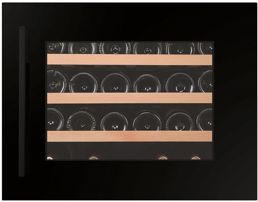 Стекло дверцы обладает защитой от УФ-лучей, что предотвращает влияние солнечного света на качество вина. Полки из дерева добавляют эстетики и удобства при использовании.