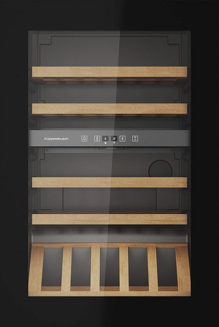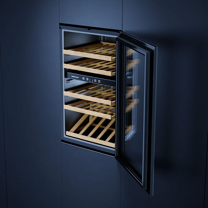 Элегантный встроенный винный шкаф выполнен в глубокoм черном оттенке с фронтальной стеклянной дверью в тонкой рамке, которая демонстрирует коллекцию и защищает бутылки от внешних воздействий. Металлические боковые стенки и аккуратные металлические ручки подчёркивают сдержанный современный характер корпуса, а древесные выдвижные полки коричневого цвета добавляют тепла и фактурности интерьеру. Интегрированная вертикальная ручка и функция открытия нажатием обеспечивают минималистичный вид фасада; стеклянная панель сохраняет аккуратность, а встроенная подсветка LED равномерно выделяет содержимое без нагрева.