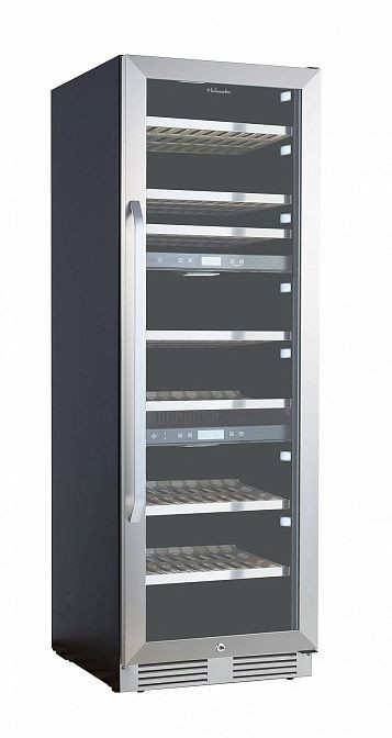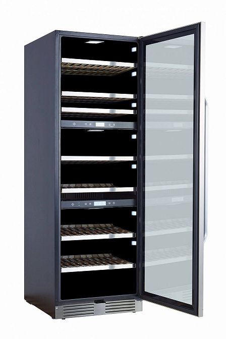 Уникальность этого винного холодильника заключается в его двухтемпературном режиме. Это позволяет хранить разные виды вина при оптимальной температуре. Диапазон установки температуры в верхней и нижней зоне составляет от +5 до +20 градусов Цельсия, что делает этот холодильник универсальным решением для любого вина.