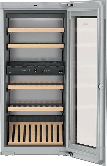 Объем холодильника составляет 195 литров, что позволяет хранить до 51 бутылки вина. Демонстрационная полка и LED-подсветка с плавным изменением яркости позволяют эффектно презентовать коллекцию вин. Встроенные полки из дерева на телескопических направляющих обеспечивают удобное и безопасное хранение бутылок.
