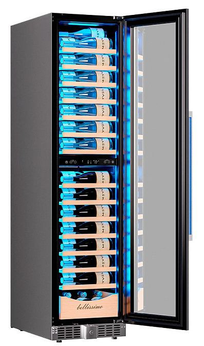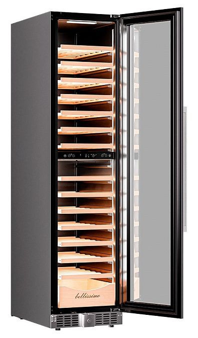 Элегантный аппарат сочетает сдержанный профиль и премиальные материалы: корпус выполнен из металла в оттенке нержавеющей стали, фронтальная дверь — стеклянная с двойным остеклением и защитой от УФ-лучей, а ручки из металла серебристого цвета подчеркивают общий минималистичный образ. Панорамное окно демонстрационного типа позволяет эффектно представить коллекцию, обеспечивая при этом стабильный микроклимат внутри благодаря встроенному вентилятору для равномерного распределения температуры. Бежевые выдвижные полки из дерева обеспечивают мягкий контраст с холодным металлом и аккуратно фиксируют бутылки в наклонных нишах, при этом набор полок позволяет разместить до 39 единиц, сохраняя удобный доступ к каждой позиции. Дверь может открываться вправо и при необходимости перевешиваться, что повышает гибкость встроенной установки, а небольшой размер по глубине и ширине делает модель пригодной для встраивания в нишу 830x600x595 мм или размещения отдельно.