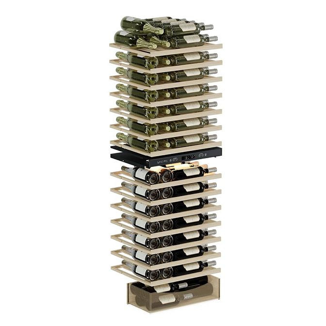 Внутри холодильника находятся 14 выдвижных полок из дерева, на которых удобно размещать бутылки. Они оснащены доводчиками для бережного хранения вина. Кроме того, внутри есть контейнер для воды и угольный фильтр, который помогает поддерживать оптимальную влажность.