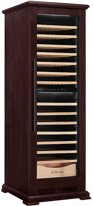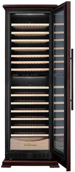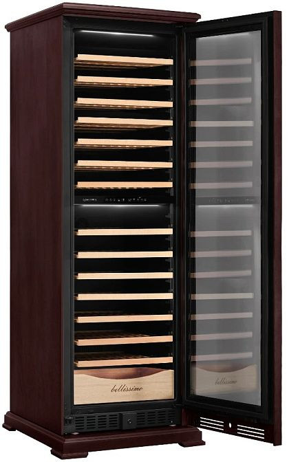 Устройство оснащено прозрачной дверью, что позволяет легко контролировать состояние вина без необходимости открывать холодильник. Компрессорное охлаждение обеспечивает стабильное и эффективное охлаждение, а общий объем холодильника в 425 литров позволяет хранить до 174 бутылок вина.