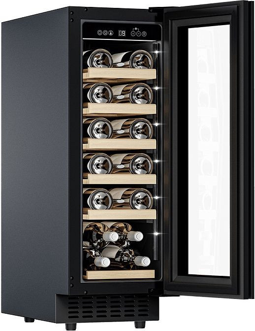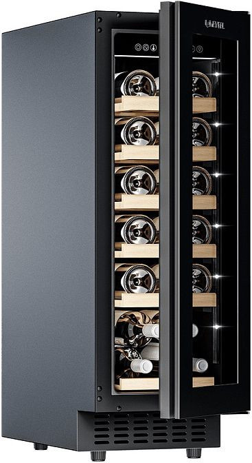 Стекло дверцы обладает защитой от УФ-лучей, что важно для сохранения качества вина. Полки из дерева не только добавляют эстетики, но и обеспечивают надежное хранение бутылок. Вентилятор для распределения температуры обеспечивает равномерное охлаждение всего пространства холодильника.