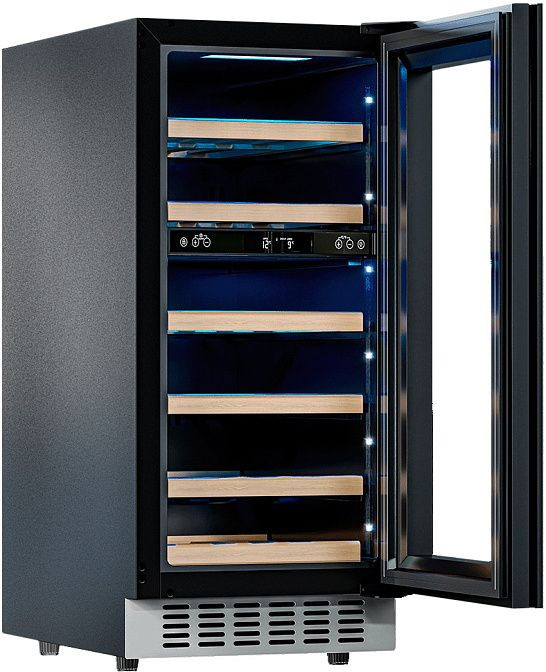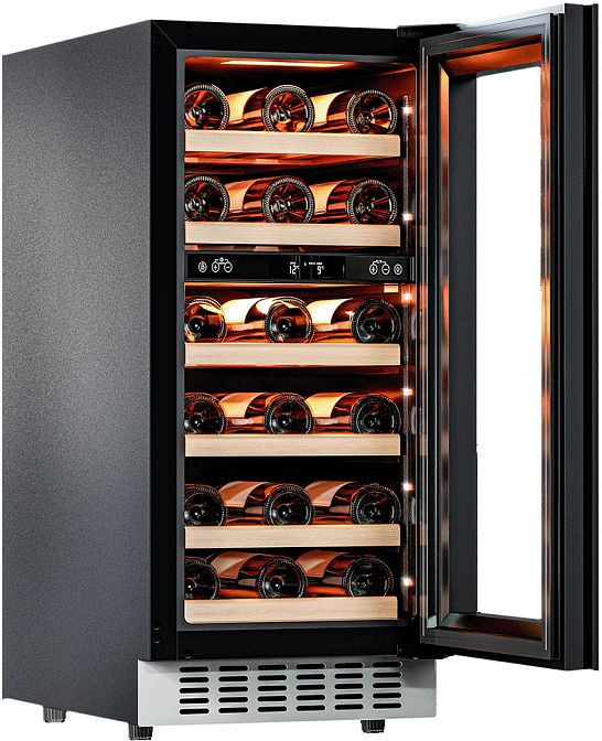 Встроенный вентилятор для распределения температуры, угольный и антибактериальный фильтры гарантируют оптимальные условия для хранения вина. Дверь с двойным стеклом и автоматическая система размораживания обеспечивают удобство и эффективность использования. Светодиодная подсветка позволяет легко найти нужную бутылку, а регулируемые ножки — установить холодильник на любой поверхности.