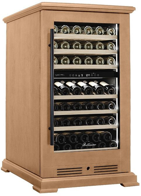 Внутреннее пространство холодильника оснащено семью выдвижными полками из дерева, на которых удобно размещать бутылки. Особенностью является наличие наклонной полки, что обеспечивает оптимальное положение бутылок для сохранения качества вина. Встроенный вентилятор обеспечивает равномерное распределение температуры по всему объему холодильника.
