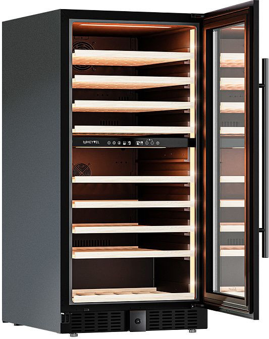 Внутри камеры располагаются девять выдвижных полок из дерева, которые не только функциональны, но и придают интерьеру холодильника особый шарм. Стекло дверцы обладает защитой от УФ-лучей, что предотвращает воздействие солнечного света на вино. Холодильник оборудован угольным фильтром и встроенным вентилятором для распределения температуры, что обеспечивает идеальные условия для хранения вина.
