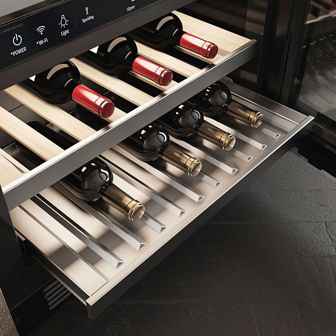 Эргономичная и строгая внешность в сочетании с продуманной функциональностью создают технику, которая органично впишется в современную интерьерную композицию. Черный металлический корпус подчеркивает статус и лаконичность, а прозрачная дверь из двойного стекла с защитой от УФ-лучей демонстрирует содержимое и одновременно защищает бутылки от вредного излучения. Ручки из стали черного цвета и аккуратная панель управления на корпусе с цифровым дисплеем сохраняют эстетическую целостность фасада, при этом реализована функция Touch Open для бесконтактного доступа.