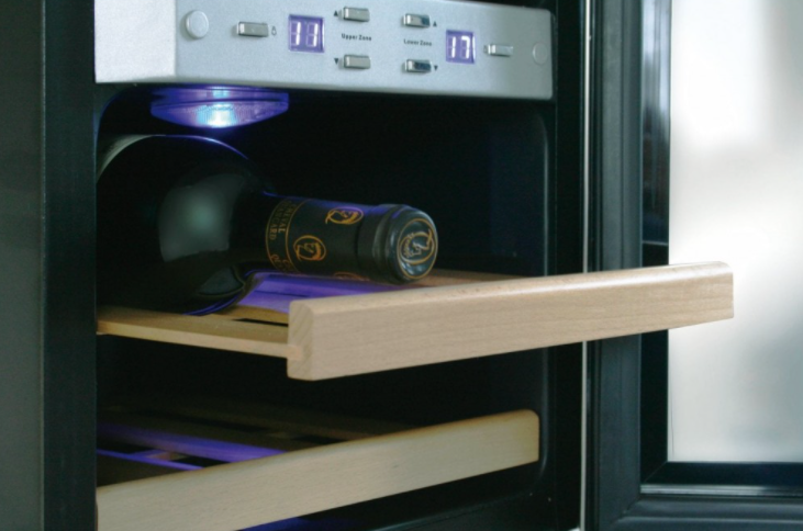 Особенность аппарата — двухтемпературный режим, реализованный в двух зонах с независимыми настройками, каждая из которых позволяет устанавливать температуру в диапазоне от +5 до +20 °C. Это дает возможность одновременно хранить разные стили вина при оптимальных параметрах: например, поддерживать оптимальную прохладу для белых и шампанских напитков и более высокую температуру для красных, не нарушая ароматический баланс. Сенсорная панель управления расположена внутри, оснащена дисплеем и индикаторами температуры и состояния включения, что делает регулировку точной и наглядной, а также предотвращает случайные изменения благодаря защите от детей.