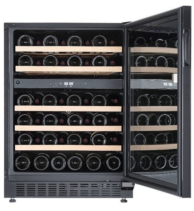 Современный встраиваемый винный шкаф выполнен в элегантном стиле Black Velvet с фронтом из черного стекла и матовыми черными ручками, которые подчёркивают минималистичную эстетику. Одно прозрачное стеклянное полотно двери защищено от ультрафиолета, позволяет наблюдать коллекцию без потери микроклимата и открывается под углом до 125° с возможностью перенавешивания; крепление реализовано по системе распашных дверец с боковым упором справа и слева. Задняя стенка Cold Metal, коричневые деревянные полки и аккуратные металлические боковые стенки создают премиальный визуальный контраст и долговечную конструкцию, а выдвижные направляющие обеспечивают удобный доступ к бутылкам.