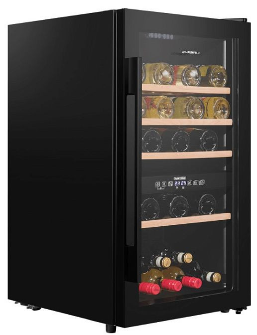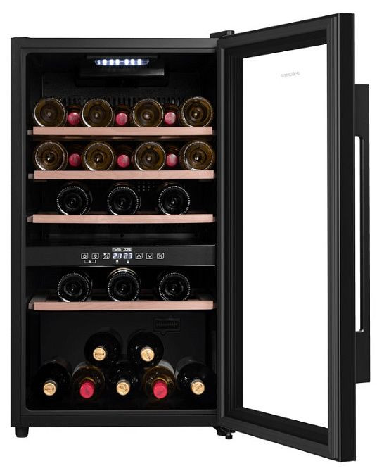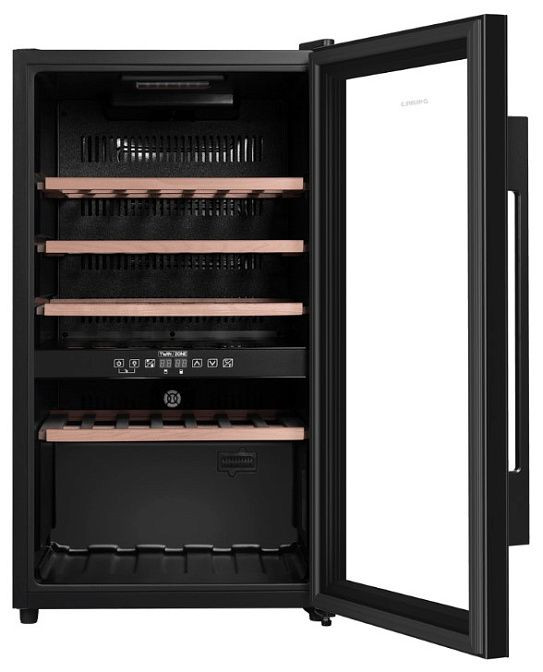Изящный корпус в черном цвете и современная эстетика придают этому прибору статусный внешний вид, гармонично вписывающийся в интерьер кухни или зоны хранения напитков. Корпус выполнен из нержавеющей стали, фронтальная панель из стекла, а дверца — в стеклянной раме со стеклопакетом, что обеспечивает визуальную привлекательность и дополнительную термоизоляцию. Продуманная геометрия и прямоугольная форма корпуса при компактных габаритах 858x480x618 мм позволяют установить изделие отдельно или в нишу с размерами 45x56-58x56 см, сохраняя аккуратность линий и мягкую интеграцию в общую мебельную композицию.