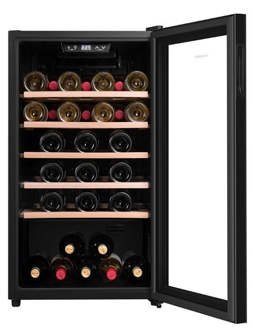 Внутренняя организация продумана для коллекции до 56 бутылок: полезный объем камеры составляет 124 литра, внутри размещено пять съемных и выдвижных полок из бука, что обеспечивает удобный доступ и гибкость при расстановке емкостей разного формата. Встроенный вентилятор совместно с циркуляционным охлаждением равномерно распределяют охлажденный воздух, поддерживая стабильный микроклимат; классический компрессор и экологичный хладагент R600a гарантируют эффективное функционирование, а электронная панель на корпусе позволяет точно регулировать температурный интервал от +5 до +20 °C. Наличие акустической и оптической сигнализации оперативно информирует о любых отклонениях, а возможность перевешивания дверей и правый дверной упор расширяют варианты размещения в помещении.