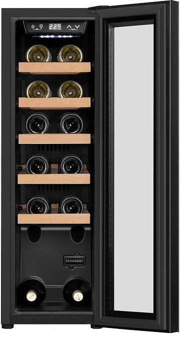 Шкаф имеет вместительность в 45 литров, что позволяет разместить до 12 бутылок вина. Пять съемных и выдвижных полок из бука обеспечивают удобное размещение бутылок. Благодаря двум температурным режимам и независимой регулировке температуры в камерах, можно хранить разные сорта вина при оптимальных для них условиях. Диапазон установки температуры варьируется от +5 до +22 градусов Цельсия.