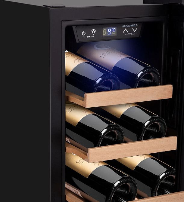 Техника обладает защитой от детей, что делает ее использование безопасным в семьях с маленькими детьми. Скрытые ручки и светодиодная подсветка придают шкафу изысканный вид. Стекло дверцы с защитой от УФ-лучей обеспечивает дополнительную защиту для вина от внешних воздействий.