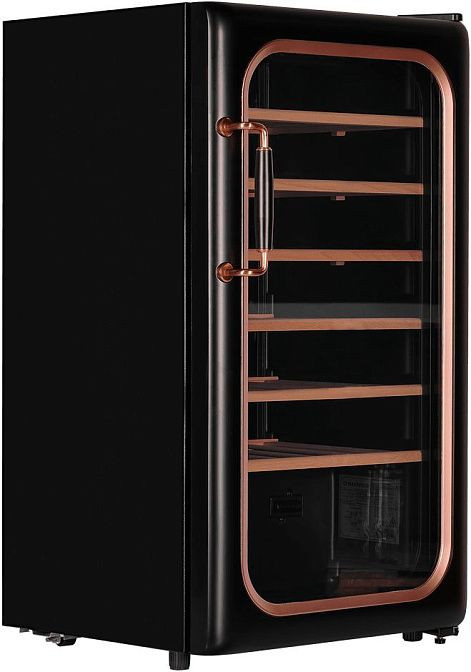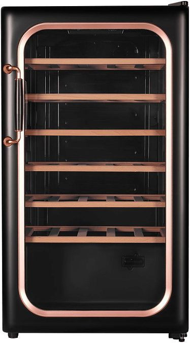 Внутри шкафа находятся шесть выдвижных полок из бука, на которых можно разместить до 34 бутылок вина. Все полки съемные, что позволяет легко менять конфигурацию шкафа в зависимости от размера и формы бутылок. Светодиодная подсветка обеспечивает удобство использования винного шкафа в любое время суток и придает ему еще больше элегантности.