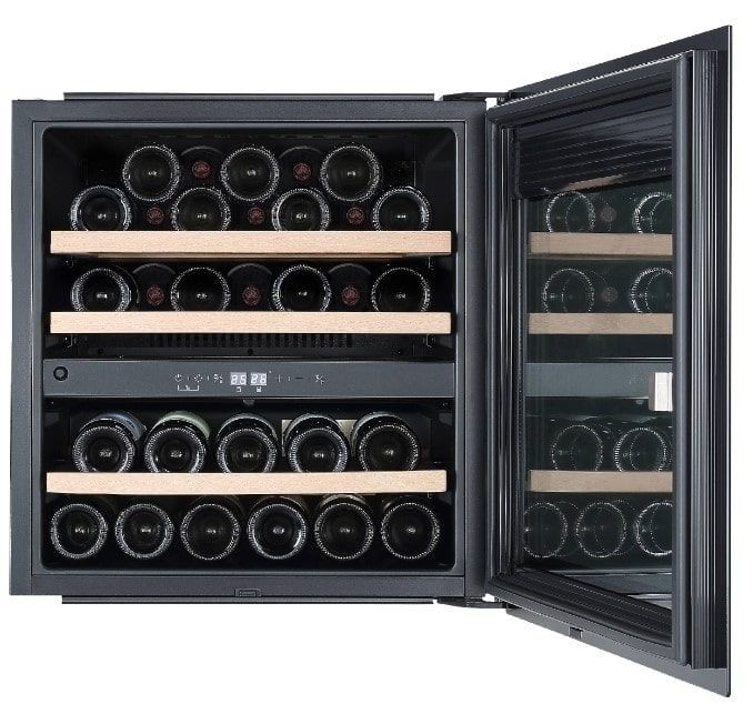 Внутри установлены деревянные выдвижные полки коричневого оттенка, обеспечивающие бережное хранение бутылок и аккуратную презентацию; предусмотрен контейнер для воды и встроенный вентилятор для равномерного распределения холода по отсеку. Двойная система охлаждения с инверторным компрессором на R600A гарантирует стабильные условия в каждой из двух зон, а независимая регулировка позволяет задать разные режимы в верхней и нижней части: диапазон установки от +5 до +18 °C в каждой зоне. Сенсорное управление Smart Touch и дисплей, расположенный внутри камеры, обеспечивают точную настройку и интуитивное управление, а память аварийной температуры и оптическо-акустическая сигнализация моментально оповестят о неполадках.