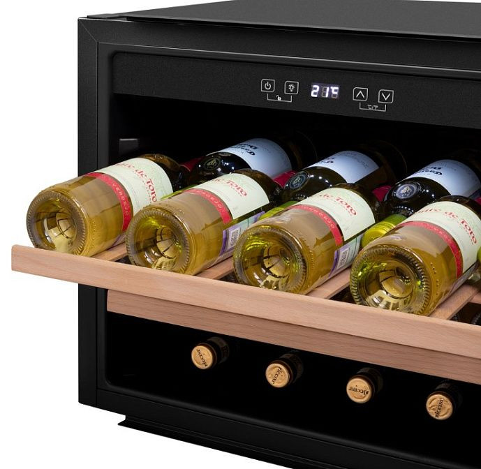 - Две выдвижные полки из бука и светодиодная подсветка упрощают доступ к бутылкам и удобны для грамотного размещения ассортимента.