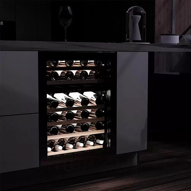 Элегантный встраиваемый аппарат сочетает лаконичный черный корпус со стеклянной дверью и аккуратной стальной отделкой, создавая современный акцент на кухне или в винном шкафу. Корпус изготовлен из прочной стали, фронт закрыт двойным стеклом с защитой от УФ-лучей, что сохраняет аромат и цвет напитков, предотвращая преждевременную деградацию. Прозрачная панель без выступающих ручек поддерживает минималистичный облик и позволяет демонстрировать коллекцию бутылок, а при необходимости дверь можно перевесить — стандартное открывание направо обеспечивает удобство монтажа в любом встроенном модуле. Система жесткого крепления door on door гарантирует надежную интеграцию в мебель без зазоров и щелей.