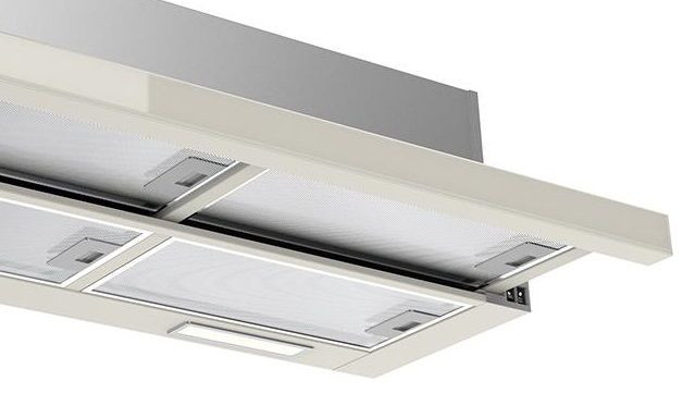Элегантный прибор в бежевом оформлении сочетает металл и стекло, предлагая современную эстетику для кухни с аккуратными линиями и выдвижным козырьком. Узкая конструкция высотой 26,5 см и шириной 89,8 см позволяет встроить модуль в шкаф или оформить как подвесной элемент, сохранив чистоту внешнего вида и свободное пространство. Панель выдвигается при необходимости, обеспечивая удобный доступ к элементам управления, расположенным сбоку: механические слайдеры обеспечивают интуитивное переключение трех ступеней без сложных настроек, а антивозвратный клапан сохраняет стабильность работы воздуховодов и препятствует обратному потоку запахов.