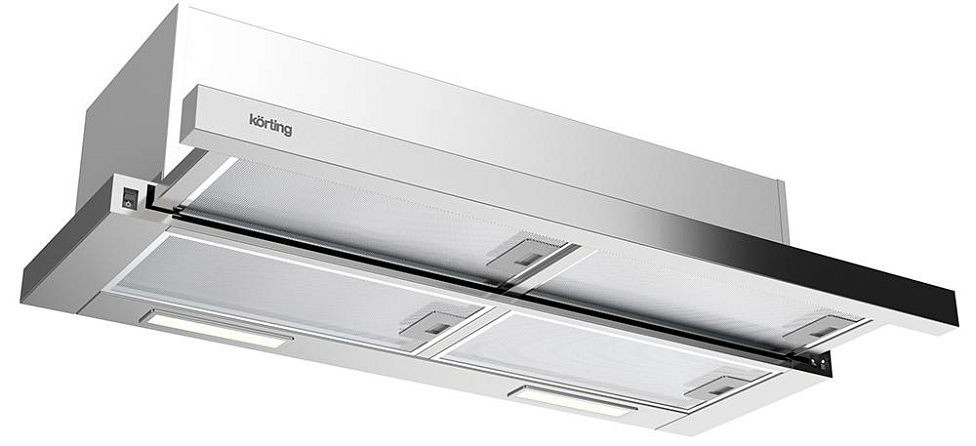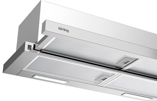 Управление выполнено механическим методом со слайдерными ползунками, расположенными сбоку для удобного доступа при встроенном размещении; дистанционный пульт не предусмотрен, индикаторы выбранной мощности и режима отсутствуют, но реализован индикатор загрязнения фильтра, сигнализирующий о необходимости обслуживания. В корпусе предусмотрен антивозвратный клапан, который препятствует обратному току воздуха, а выдвижной козырек увеличивает площадь захвата и снижает риск распространения испарений.