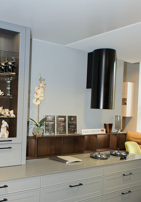 Управление вытяжкой осуществляется с помощью сенсорных переключателей, расположенных спереди. На панели управления также имеется дисплей, на котором отображается информация о текущем режиме работы. Вытяжка оснащена таймером, который позволяет задать время работы устройства.