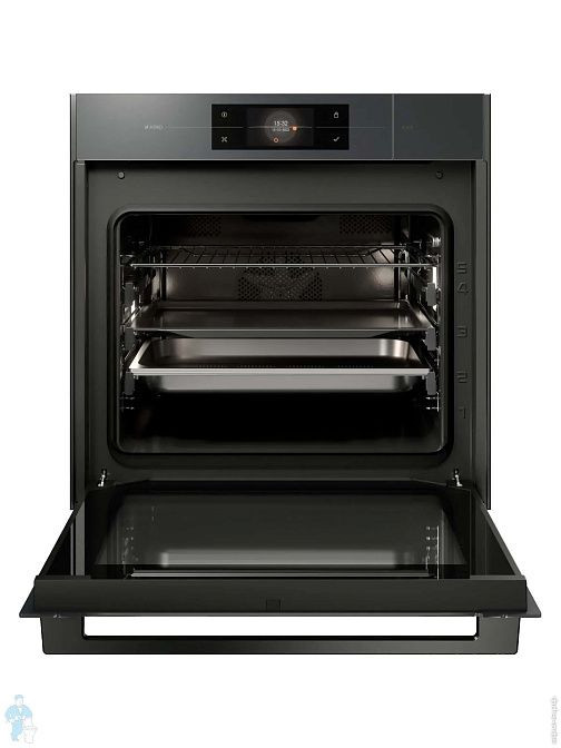 Этот встраиваемый прибор выполнен в сдержанном современном стиле Pearl Grey, сочетая матовую бронзовую ручку и черное стекло фронтальной панели для аккуратного интегрирования в интерьер. Объем большой камеры составляет 73 литра, а внутренняя поверхность покрыта пиролитической эмалью SilverMatte, что обеспечивает стойкость к загрязнениям и облегчает уход после интенсивного использования. Дверца с четырьмя стеклами и съёмным внутренним остеклением сохраняет температуру и безопасность, а двухстороннее LED-освещение обеспечивает равномерную подсветку каждого уровня. Фронтальная панель оборудована TFT-дисплеем и сенсорным управлением с эргономичными поворотными регуляторами и TouchControl, позволяющими точно выставлять параметры приготовления и контролировать прогресс с индикацией текущего режима.