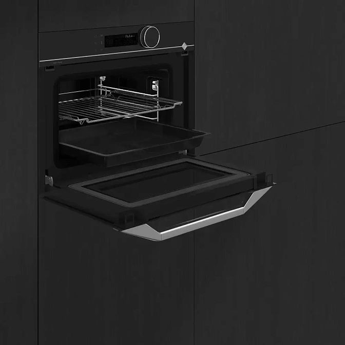 Функциональность объединяет 11 рабочих режимов, включая электрический гриль мощностью 1750 Вт и конвекцию с горячим воздухом, а также комбинированные варианты с подачей пара: горячий воздух + пар, нижний нагрев + конвекция, традиционный нагрев + пар и режимы с вариогрилем. Комби-пароварка поддерживает режимы для выпечки с поднятием теста, разморозки, сушки и поддержания тепла, а автоматические программы — 46 рецептов — позволяют запустить приготовление с оптимальными параметрами. Пиролитическая очистка делает уход практически бесшовным, преобразуя загрязнения в пепел, который легко удалить.