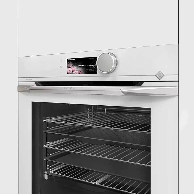 Утонченная белая отделка этого прибора делает его гармоничным дополнением современной кухни: ровные линии фасада, аккуратно интегрированный TFT дисплей и сенсорные элементы управления создают ощущение технологичности и простоты одновременно. Поворотные переключатели дополняют панель, сохраняя удобство настройки режимов вручную, а подсветка элементов управления облегчает работу в условиях слабого освещения. Большая четырехслойная дверца обеспечивает надежную теплоизоляцию и приятный внешний вид, а механизм откидного открывания с доводчиком делает эксплуатацию безопасной и бесшумной.