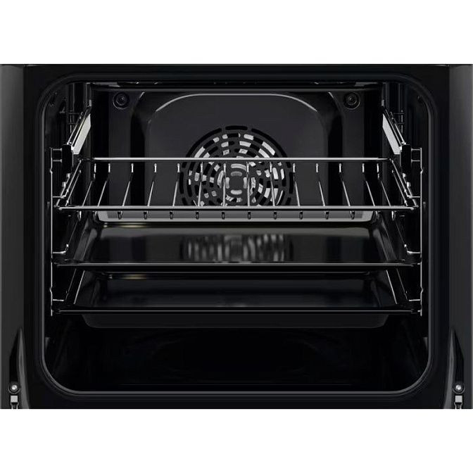 Духовой шкаф Electrolux EOF5H50BX создан для тех, кто ценит лаконичность и функциональность в интерьере. Корпус сочетает черный цвет с вставками из нержавеющей стали, что обеспечивает универсальность при встраивании в кухонный гарнитур шириной 56 см; высота и глубина соответствуют стандартной нише 590x560x550 мм, а компактностью прибор не выделяется — при этом гармонично выглядит в любом решении. Передняя панель аккуратно оформлена поворотными переключателями и LED дисплеем, на котором отображается текущее состояние: режим работы, температура нагрева, время до отключения и другие необходимые индикации. Дверца с двумя стеклами надежно удерживает тепло, а внутренняя эмаль легкой очистки упрощает уход после интенсивного использования.