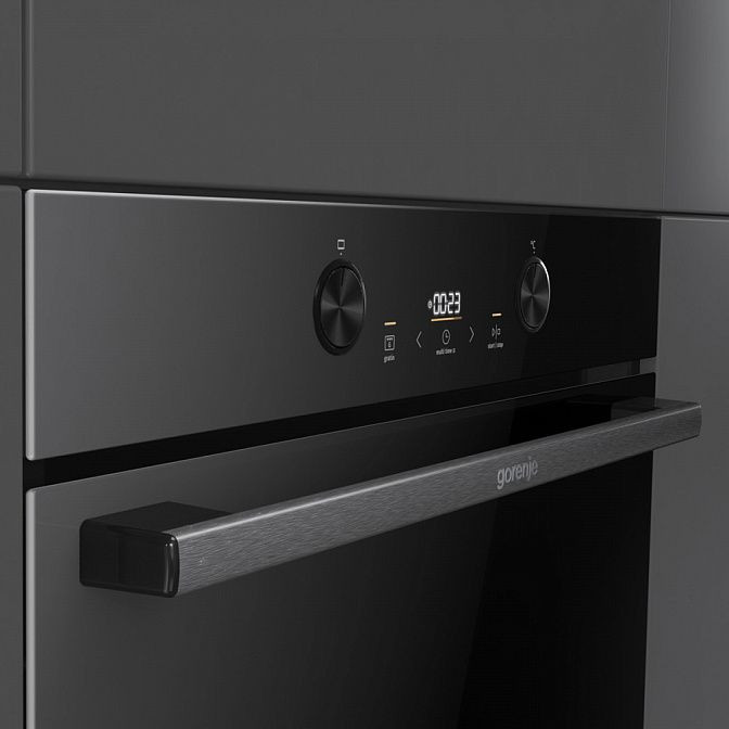 Элегантный корпус в сочетании черного и нержавеющей стали подчеркивает современный минимализм и позволяет технике органично вписаться в интерьер любой кухни. Встроенная модель предназначена для установки в нишу 590x560x551 мм и предлагает просторную камеру объемом 77 литров, что позволяет готовить крупные порции и использовать до трех уровней размещения противней. Откидная дверца с холодным фронтом и двумя стеклами, внутреннее стекло съемное, а доводчик обеспечивает плавное закрытие — все это повышает удобство обслуживания и безопасность эксплуатации.