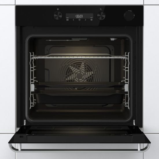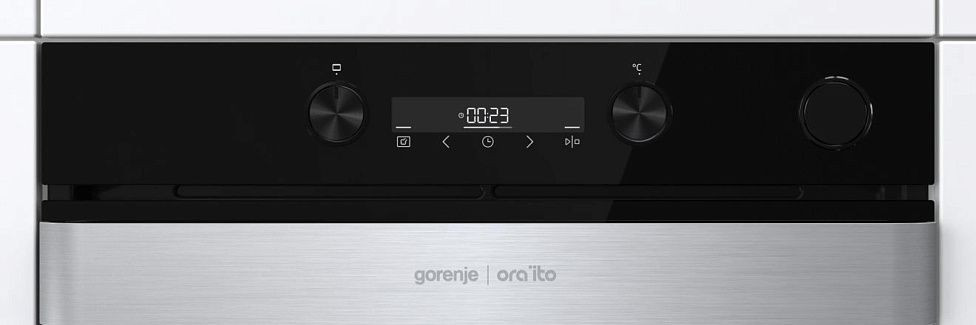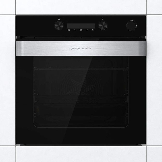 Духовой шкаф Gorenje BSA6737ORAB — современный встроенный прибор, объединяющий строгую эстетику и продуманную функциональность. Корпус выполнен из нержавеющей стали с черной окантовкой и черной ручкой, панель управления изготовлена из стекла; фронтальная сенсорная панель IconLED аккуратно вписывается в фасад и обеспечивает точное электронное управление. Дизайн ориентирован на гармоничное сочетание с кухонным гарнитуром: компактный полноразмерный формат 60 см и глубина 55 см позволяют разместить агрегат в стандартной нише, при этом внешний вид сохраняет лаконичную современную линию. Механика дверцы работает плавно благодаря системе GentleOpen/GentleClose, а съемный стеклопакет и холодная дверь повышают безопасность и удобство обслуживания.