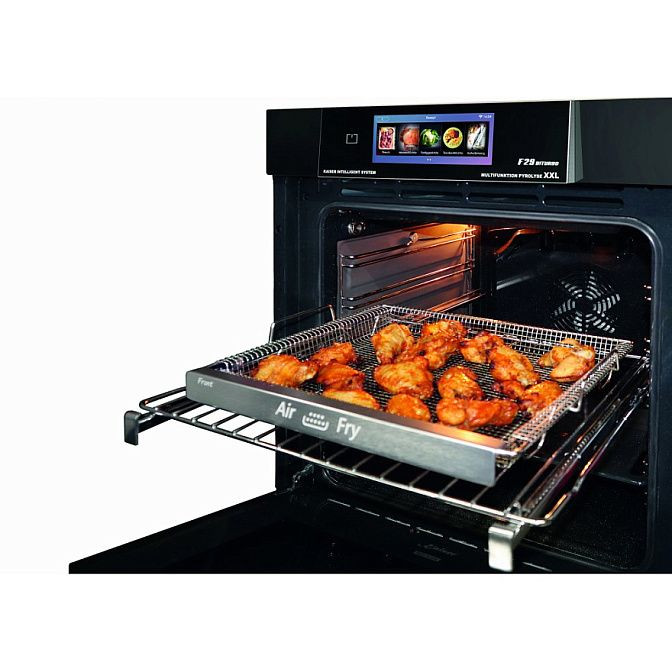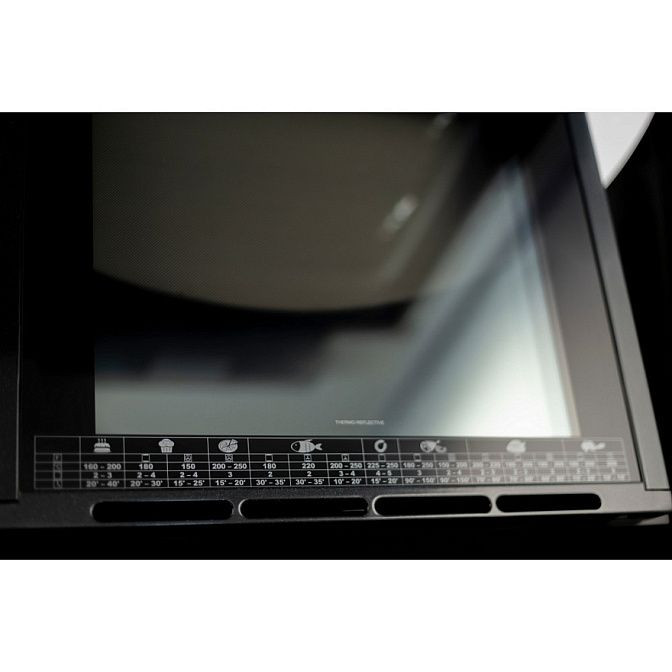 Элегантный встроенный прибор в черном исполнении сочетает современный внешний вид и продуманную эргономику: глубокая камера объемом 79 л скрыта за четырехслойной дверцей с холодным фронтом и съемным внутренним стеклом, что облегчает уход и повышает безопасность. Передняя панель оснащена ярким TFT дисплеем и сенсорными переключателями, интуитивно отображающими режим работы и таймер; на дверце нанесены рецепты, которые помогут в приготовлении различных блюд без лишних накладок. Compact Door поддерживает аккуратный открывающий механизм откидного типа, а внутренняя эмаль легкой очистки делает поверхность менее восприимчивой к загрязнениям.
